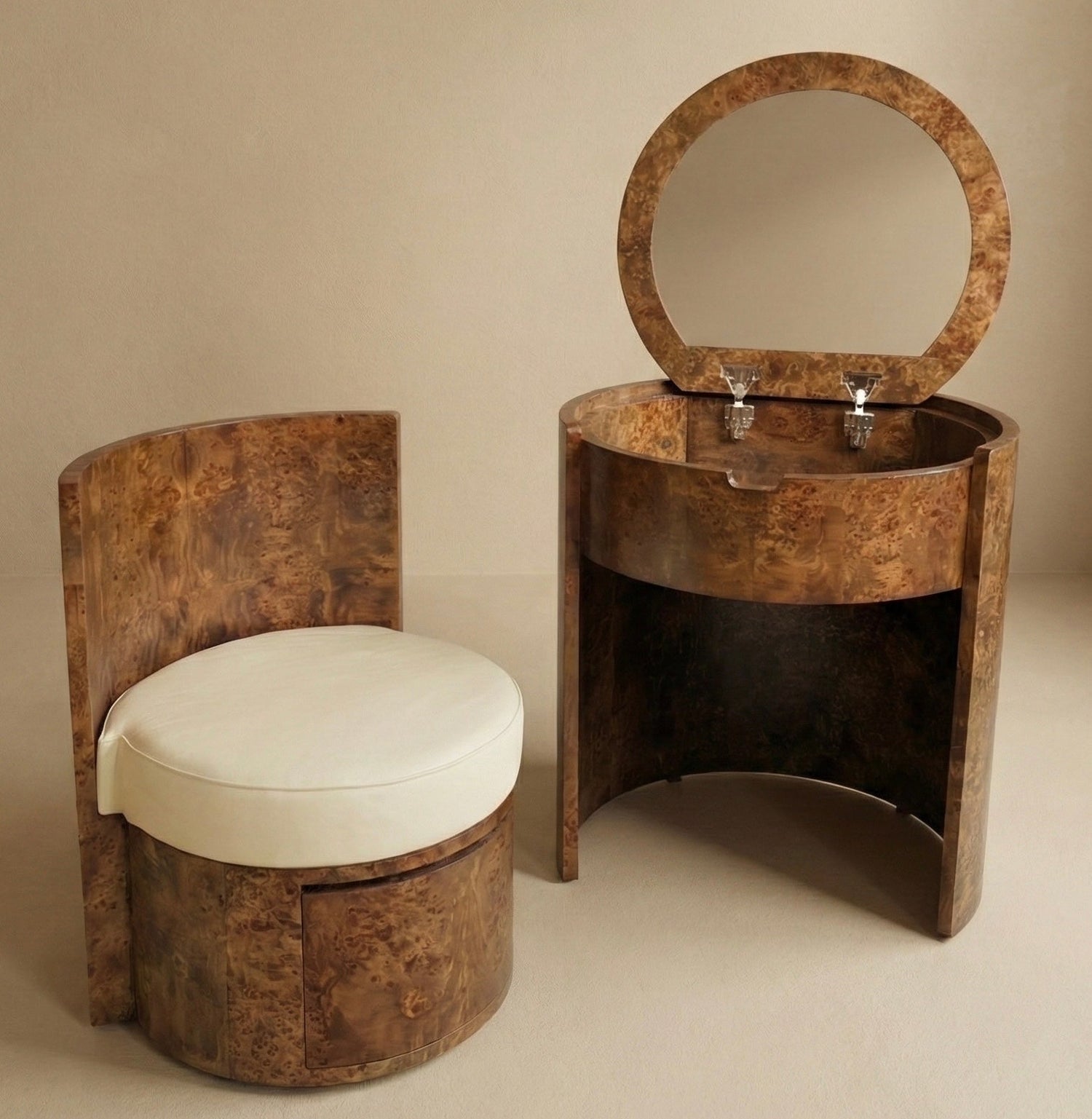 Each set includes a vanity table with a flip-up mirror, paired with a coordinating leather-cushioned chair featuring a discreet storage drawer.